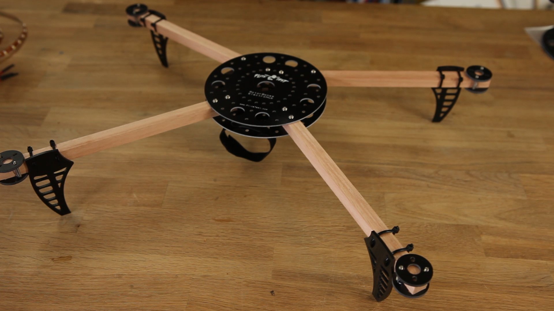 Josh's Electrohub quadcopter features black spray painted wooden booms and painted camera tray.